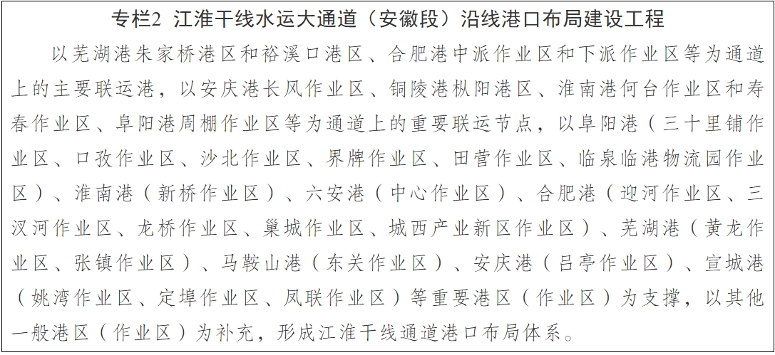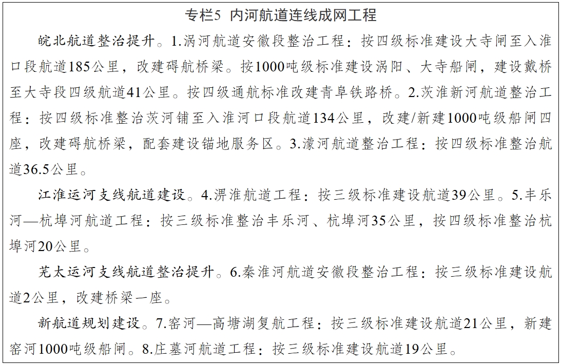 (六)整治和新建一批内河航道。拓展江淮干线水运大通道航运服务纵深,实现水运“门到门”服务。加快推进涡河航道安徽段整治,谋划推进茨淮新河、濛河等皖北航道整治提升。研究建设淠淮航道、丰乐河—杭埠河等江淮运河支线航道。提升芜太运河支线航道等级,尽快开工建设秦淮河航道安徽段整治工程,谋划推进青弋江航道整治等工程。规划建设窑河—高塘湖、庄墓河等一批新航道。推进阜阳港颍上港区南照作业区综合码头(一期)、亳州港综合码头(一期)、合肥港长丰庄墓码头等港口(码头)项目。(责任单位:省交通运输厅、省引江济淮集团、省港航集团,配合单位:省发展改革委)