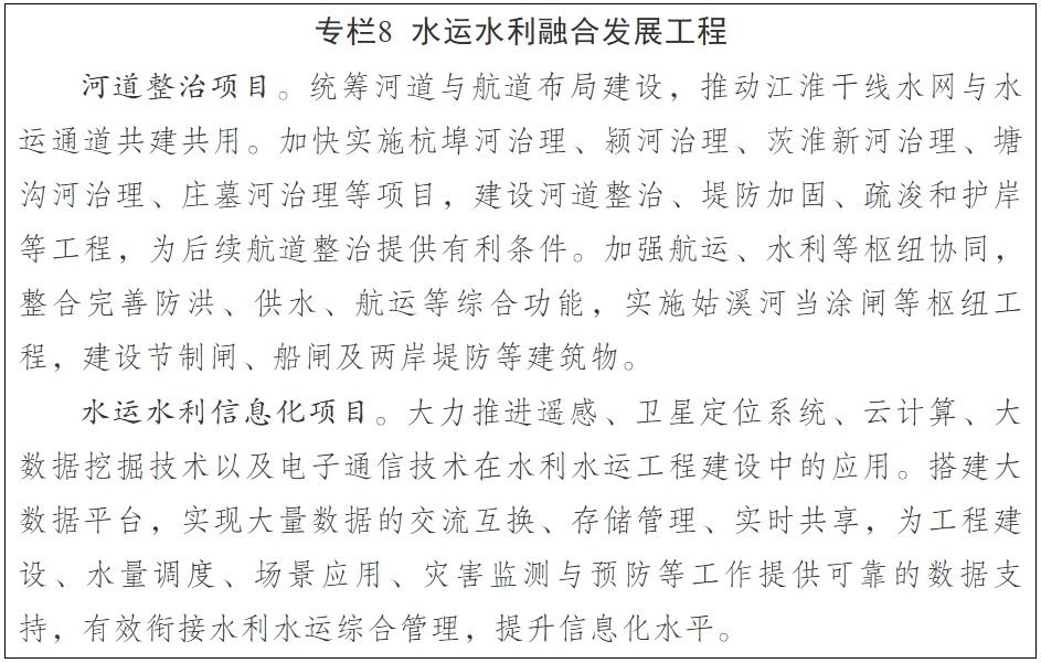 (十四)加快实施河道与航道整治融合项目。在畅通防洪通道的基础上,加快推进主要支流治理。积极推动船闸与节制闸协同建设,统一枢纽规划布局和管理调度。优化简化航运项目洪水影响评价类和水利工程航道通航条件影响评价等行政许可工作流程,项目符合河湖岸线利用规划、列入水运水利融合发展项目库的,可作为规划支撑依据。(责任单位:省水利厅、省交通运输厅)