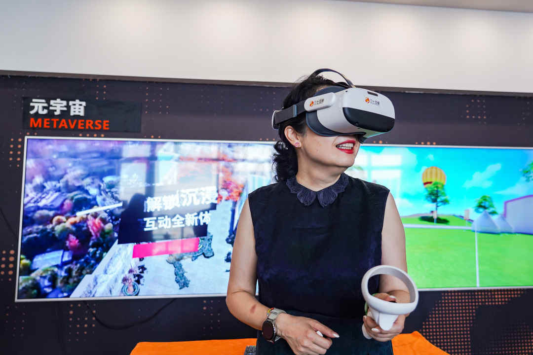 调研团成员感受元宇宙技术制作的非遗文化科普小游戏