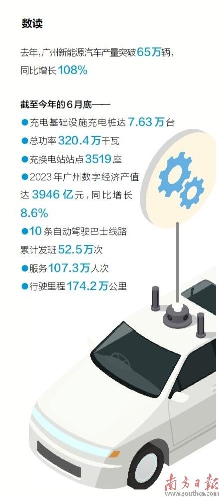 统计数据显示,去年,广州新能源汽车产量突破65万辆,同比增长108%。截至今年的6月底,充电基础设施充电桩达7.63万台,总功率320.4万千瓦,充换电站站点3519座。2023年广州数字经济产值达3946亿元,同比增长8.6%。
