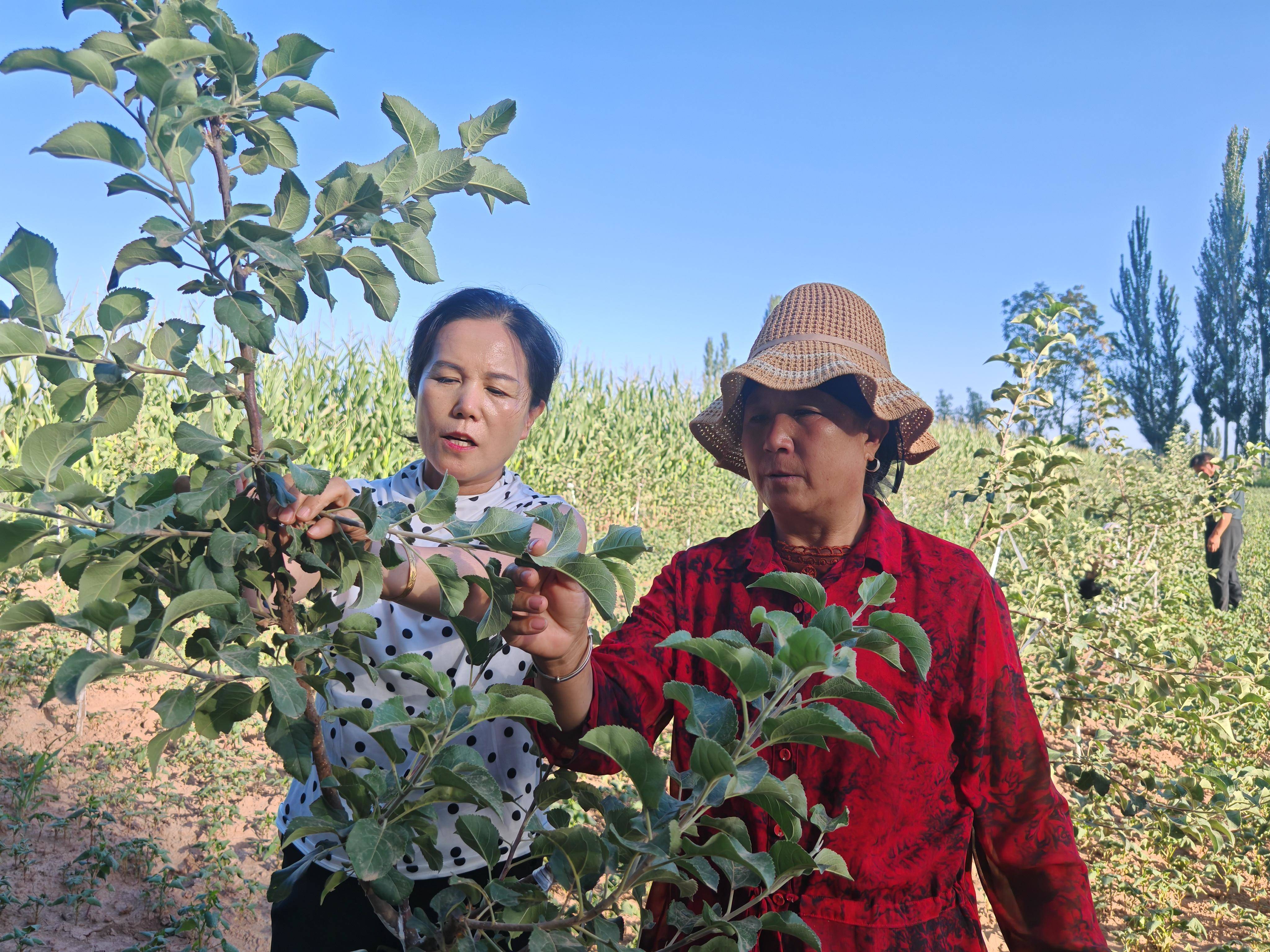 7月25日,在利通区扁担沟镇黄沙窝村,从陕西省铜川市引进的一棵棵青砧1号苹果苗长势良好。我市科技特派员丁雪芬向村民马伟花讲解苹果苗的压枝技术。