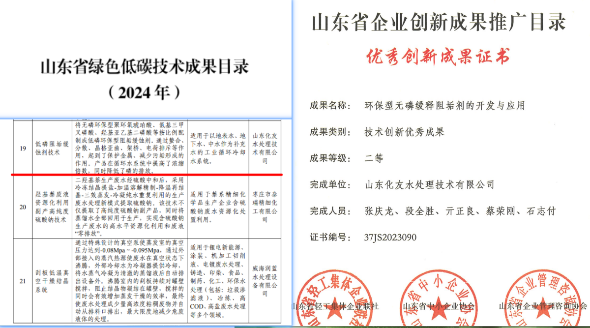 据了解,入选《2024年山东省绿色低碳技术成果目录》中的技术成果可获得行业部门、各类工业企业、基金及风险投资机构优先支持。前期县科技部门面向全县征集水治理、碳减排、土壤及地下水风险管控与修复等领域先进技术成果并推荐至省科技厅。环保型低磷阻垢缓蚀剂技术入选省绿色低碳技术成果目录的同时,还荣获了山东省企业优秀创新成果二等奖证书,在循环水系统中运用该项技术可降低磷的排放,提高浓缩倍数,起到保护金属、减少污垢形成的作用。