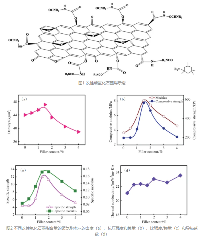鉴于石墨烯与聚氨酯泡沫基体的相容性并不是十分优异,故而可以利用对石墨烯进行改性的方式,增大复合材料中石墨烯的比例,进而放大石墨烯对聚氨酯泡沫的增强作用。Li等以二异氰酸酯为改性剂,将异氰酸盐基团接枝到氧化石墨烯上,提高了氧化石墨烯与基体的相容性(图1为改性后氧化石墨烯),使其可以很好地分散在PU基质中,作为气泡的成核剂,缩小泡孔尺寸;而且改性氧化石墨烯上的异氰酸盐可以参与PU的发泡反应,从而提高发泡过程中的气泡壁强度,减少孔隙破裂的发生。当改性氧化石墨烯加入量为1.5wt%时,复合材料的压缩强度达到最大值,提升了200%,图2为不同改性氧化石墨烯含量的聚氨酯泡沫的相关参数。