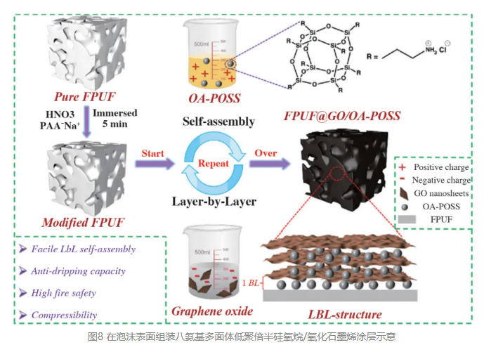 因为所产生的涂层通过各种引力吸附在基体表面,故而层层自组装法的一大优势就是产生的外保护层要优于浸渍涂覆法产生的外保护层。例如,将聚氨酯泡沫交替浸泡在八氨基多面体低聚倍半硅氧烷溶液(阳离子)和氧化石墨烯悬浮液(阴离子)中,在泡沫基体表面形成混合保护层(图8为在泡沫表面组装八氨基多面体低聚倍半硅氧烷/氧化石墨烯涂层示意图)。该保护层不仅能显著改善聚氨酯泡沫的火焰腐蚀性和烟雾抑制特性,而且还显著提高了其抗拉强度。与纯聚氨酯泡沫相比,添加保护层的聚氨酯泡沫的抗拉强度提高了42%;锥形量热计试验结果表明,与纯聚氨酯泡沫相比,添加保护层的聚氨酯泡沫的热释放速率峰值(PHRR)和总热释放量(THR)分别降低了67.3%和28.3%。此外,烟生成速率峰值(PSPR)和总烟释放量(TSR)也分别降低了42.9%和65.03%。这表明,该涂层作为一种防火涂层是非常有效的。同时CO释放量(COY)和CO2释放量(CO2Y)的显著下降(分别为62.3%和21.3%)也表明,添加此保护层的聚氨酯泡沫在燃烧条件下抑制了窒息气体的产生,这是在建筑火灾场景中降低相关火灾风险的关键。