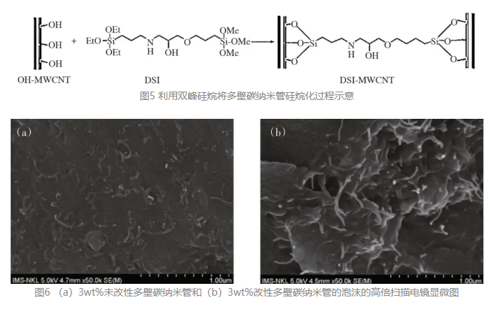 在聚氨酯发泡体系中加入碳纳米管可使得前驱体溶液黏度增加,从而阻止了泡沫制备过程中气泡的形成和生长;因此,理论上聚氨酯泡沫中碳纳米管含量越高,其结构中孔隙率也就越低,压缩强度也就越大。但碳纳米管表面存在大量的活性基团,导致它很容易发生团聚现象,这对其在聚氨酯泡沫内的分散十分不利,所以利用改性后的碳纳米管增强聚氨酯泡沫就成了人们的最佳选择。然而虽然碳纳米管经过改性,分散性有所提高,但团聚现象仍然存在,如Yaghoubi等利用双峰硅烷(DSI)将多壁碳纳米管硅烷化用以降低团聚性(图5为多壁碳纳米管改性过程);其结果为在改性多壁碳纳米管加入量为1.5wt%时得到最好的改性聚氨酯泡沫样品,模量和抗拉强度分别提高了53%和20%;而Duc等先将多壁碳纳米管酸化以接枝羧基,再利用羧基基团与苯胺的氨基基团之间的相互作用在多壁碳纳米管表面附着苯胺,通过这种方式提高分散性,经过实验后确定苯胺化多壁碳纳米管最佳加入量为3wt%,所制备的复合材料压缩强度提高了39%,图6为多壁碳纳米管改性前后的扫描电镜图片。