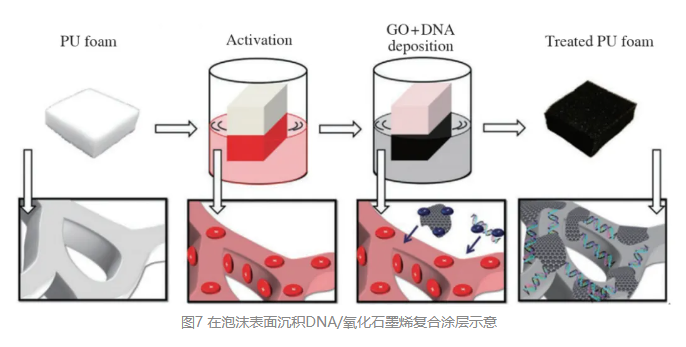 脱氧核糖核酸(DNA)就是一个例子(图7为在泡沫表面沉积DNA/氧化石墨烯复合涂层示意图),在DNA/氧化石墨烯复合涂层中,DNA被用作功能性黏着剂,当它暴露在热和火焰中时会产生稳定的碳质结构,将氧化石墨烯黏连在一起,从而产生对热量和挥发物的屏障;具体表现为添加涂层后的聚氨酯泡沫的热释放速率(HRR)和总烟雾释放峰值(TSR)分别下降了75%和30%。