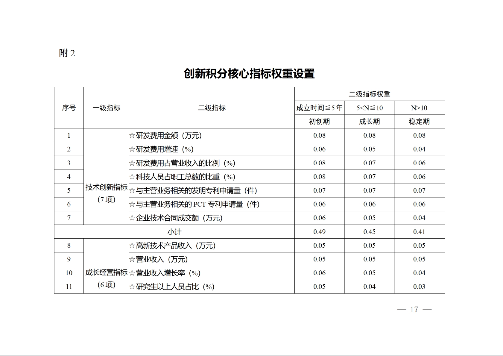 在指标权重设置上,以突出对企业创新能力评价、注重对企业成长经营能力考察为导向,同时划分了初创期、成长期、稳定期企业不同阶段,确定了3类一级指标及18个二级指标的权重赋值(见附2),并将根据实践情况持续优化。鼓励各地方结合自身实际,在核心指标的基础上,充分考虑区域差异与特点,自主探索形成地方指标、指标权重和积分计算方法,构建具有区域特色的积分体系。