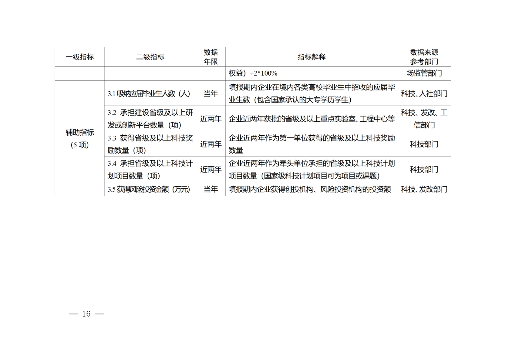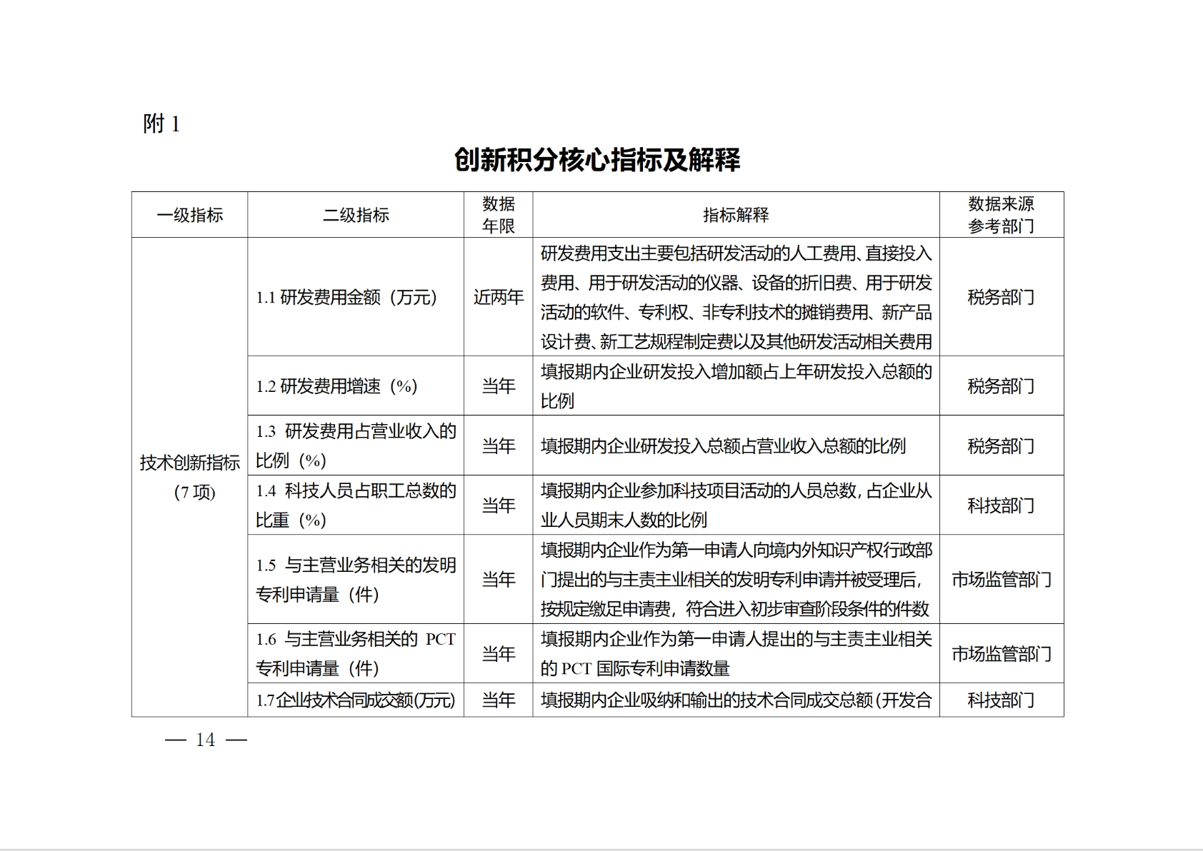 创新积分核心指标共涵盖3类一级指标18个二级指标(见附1)。第一类是技术创新指标。该类指标衡量企业在创新研发方面的投入以及最终创新结果,具体包括研发费用金额、研发费用增速、研发费用占营业收入的比例、科技人员占职工总数的比重、与主营业务相关的发明专利申请量、与主营业务相关的PCT专利申请量、企业技术合同成交额等7个指标。第二类是成长经营指标。该类指标衡量企业长期可持续的成长经营能力,具体包括高新技术产品收入、营业收入、营业收入增长率、研究生以上人员占比、研发费用加计扣除所得税减免额、净资产利润率等6个指标。第三类是辅助指标。该类指标对企业创新能力进行补充评价,具体包括吸纳应届毕业生人数、承担建设省级及以上研发或创新平台数量、获得省级及以上科技奖励数量、承担省级及以上科技计划项目数量、获得风险投资金额等5个指标。