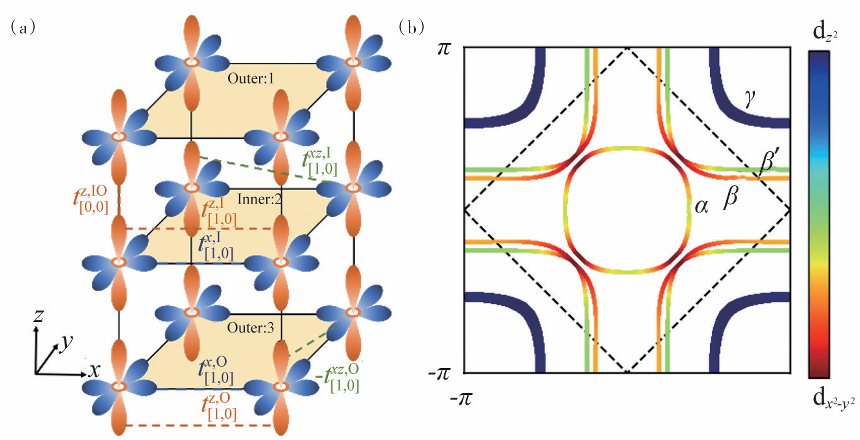 图5 La4Ni3O10的三层双轨道格子示意(a);基于三层双轨道模型计算的La4Ni3O10费米面(b)