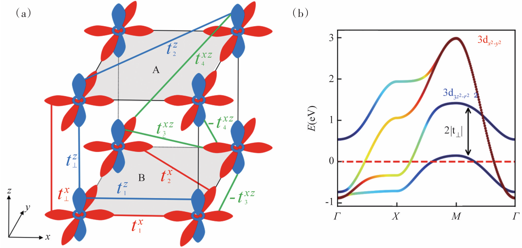 图2 La3Ni2O7双层两轨道格子示意(a);双层两轨道模型计算的La3Ni2O7能带(b)