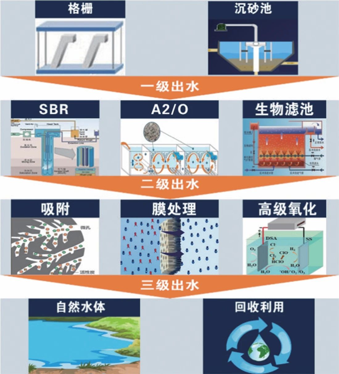 由于二级处理单元对新污染物的去除效果有限,为降低新污染物对受纳水体的不利影响,通过深度处理工艺可进一步去除具有难生物降解性或微生物毒性的痕量新污染物,以获得符合排放和回用标准的高质量出水(图3)。