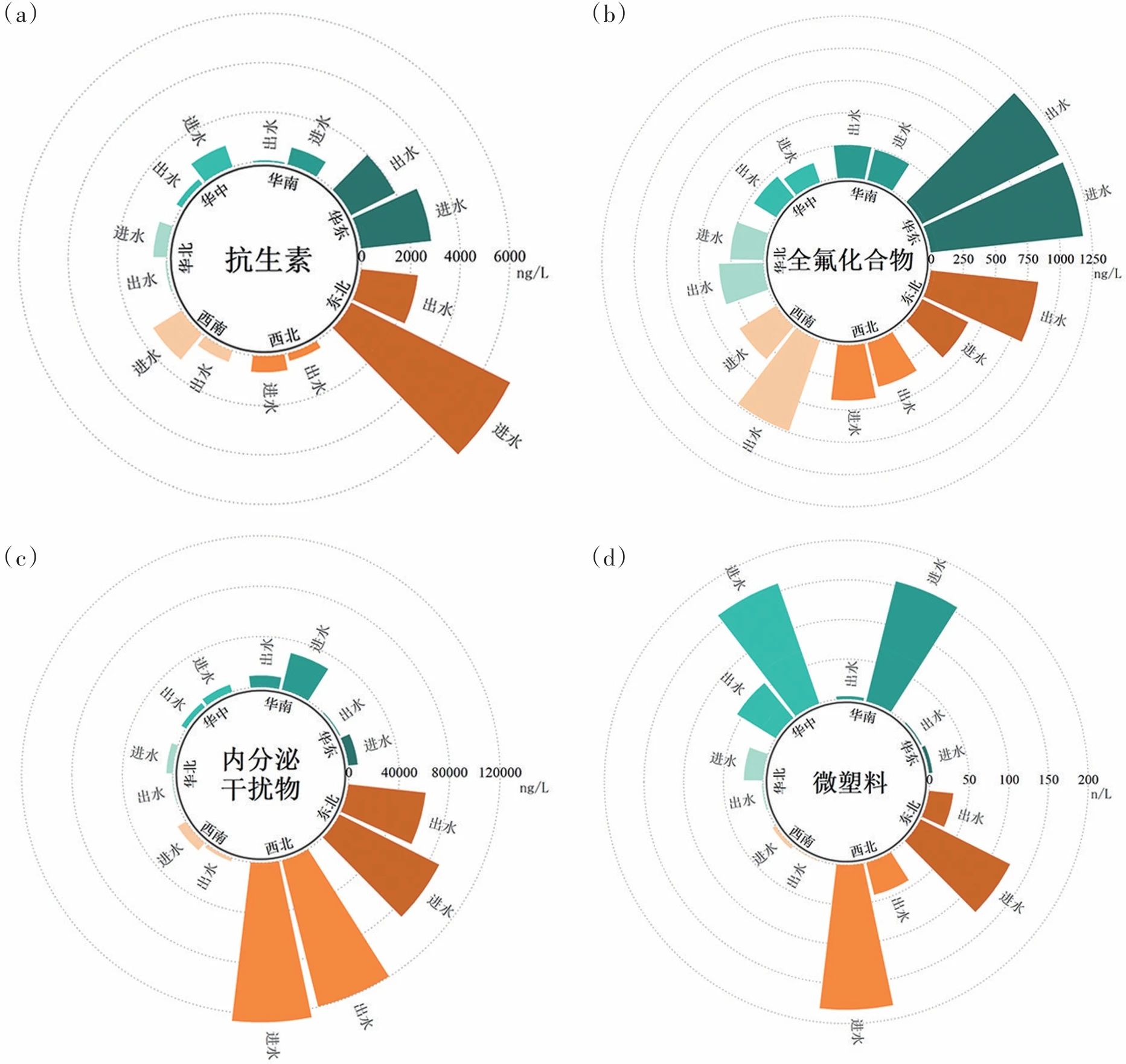 污水处理厂中新污染物浓度还受季节性因素的影响,主要体现在不同季节降雨量和人类药物用量变化。夏季高降雨量增加污水处理厂的总污水量,在降雨充足区域,由于降雨对污染物浓度起到稀释作用,使得新污染物浓度显著低于其他区域。对于人口密度较大的城镇而言,生活污水和医疗废水是城市污水的重要组成部分,并且家庭和临床常用的大环内酯类、氟喹诺酮类和磺胺类等抗生素药物,这些药物的使用量通常会随着寒冷时期疾病发病率的增加而增加,导致冬季污水中抗生素浓度高于夏季。