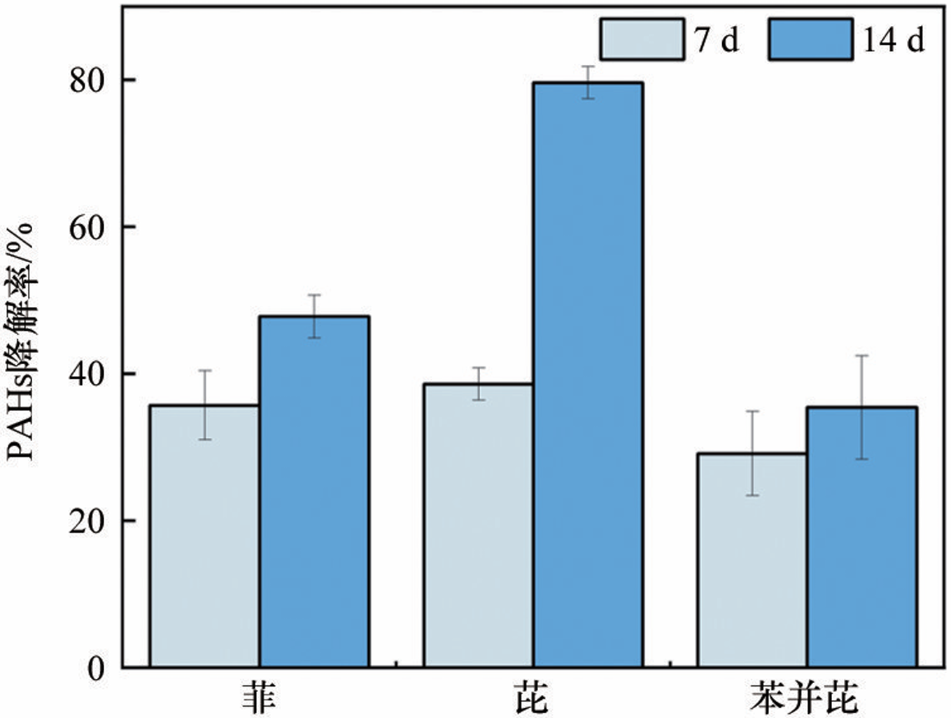 该菌群除了降解BaP外,对菲和芘具有不同程度的降解,表现出一定的普适性。从图3可以看出,YQ-BaP菌群在7d后对30mg/L BaP和菲的降解率为38.69%和47.78%,而对芘的降解效果明显,培养7d后对30mg/L芘的降解率为38.57%,培养14d后降解率达到了79.59%。一般情况下,PAHs的分子量越大,微生物越难降解,菲和芘的分子量更小,水溶解度更高。本研究中,该菌群芘降解效果最好,可能是BaP厌氧降解过程会产生菲和芘这两种中间产物,厌氧降解菌群之间存在相似性,微生物生成和分泌这两种PAHs降解酶系。从海底2.5km处厌氧沉积物筛选出的白腐真菌Schizophyllium commune 20R-7-F01能对菲、芘和BaP都存在降解效果,但降解率不一,培养10d后降解率分别为25%、18%和13%。王慧等分离出的Thalssospira sp.strain TSL5-2,可降解菲、芘、荧蒽(初始质量浓度为20mg/L)和苯并蒽(8mg/L),但不能降解BaP。本研究富集的YQ-BaP菌群,可以降解3~5环的PAHs,尤其对芘的降解效果最好,存在PAHs污染修复应用潜力。