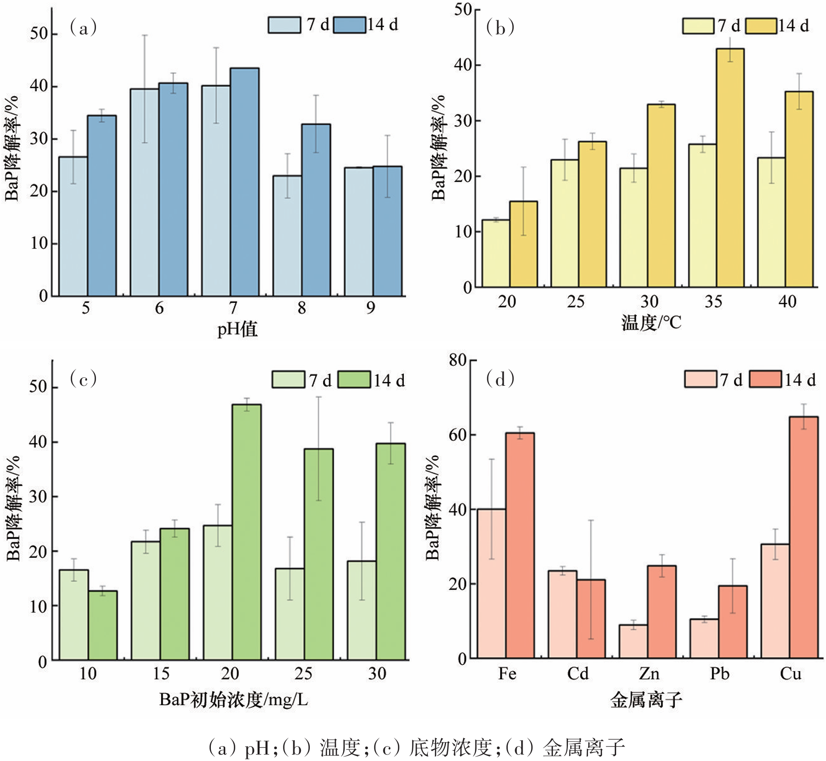 pH=7和温度35℃的条件下,研究了BaP不同初始浓度对YQ-BaP菌群降解效果的影响,如图4(c)所示。培养14d后BaP不同初始浓度下降解率从大到小为20mg/L>30mg/L>25mg/L和30mg/L,当BaP浓度为10mg/L时,培养14d后BaP降解率为12.68%。随着BaP浓度的提高,YQ-BaP菌群对BaP的降解效果也随之增加,当BaP浓度为20mg/L时降解率最高,培养14d后可达到46.89%。BaP初始浓度高于20mg/L时,降解率趋于平稳,维持在39.75%左右。YQ-BaP菌群对较高浓度的BaP初始有耐受性。当BaP浓度过低时,菌群正常生长所需的碳源不足,从而影响代谢繁殖和降解效果。当BaP浓度大于20mg/L时对菌群中部分微生物细胞的胁迫作用更强,影响菌群正常的代谢活动。初始底物浓度过高或过低对降解实验效果均会产生影响。
