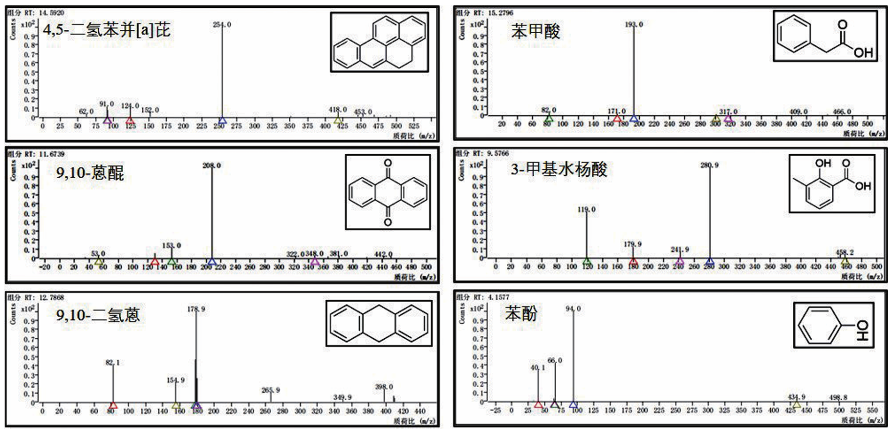 本实验采用了气相色谱-质谱联用技术(GC-MS)鉴定出YQ-BaP菌群厌氧降解过程中第1、7和14天BaP的代谢产物,推测了BaP厌氧降解的途径。在溶液中加入等体积的乙酸乙酯,振荡超声20min,循环萃取3次,离心5min(5000r/min),所得的萃取液旋蒸至干,加入20mL甲醇后旋蒸至1mL,使用GC-MS进行全波长扫描。色谱条件:HP-5MS色谱柱(30.0m×250μm,0.25μm),柱温温度为280℃,气化室温度280℃,传输线温度为280℃,载气He,载气流量1.0mL/min,分流比20∶1,进样量为1mL。电子离子源(EI)电压为70eV,温度为230℃,四极杆温度为150℃,扫描模式为Scan,扫描质量范围为33~500u。