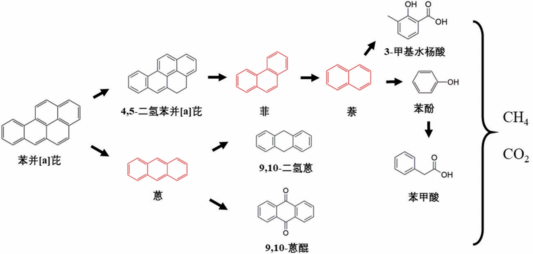 从污泥-秸秆联合厌氧污泥体系中富集出的YQ-BaP菌群,该菌群最主要的菌门为Proteobacteria,约占94.49%,而优势菌属为Pseudomonas和Methyloversatilis。该菌群除能降解苯并[a]芘外,对菲和芘也有良好降解效果。YQ-BaP菌群对10~30mg/L浓度范围内的苯并[a]芘具有耐受性,在温度为35~40℃、pH=7、苯并[a]芘初始浓度为20mg/L时该菌群对苯并[a]芘的降解率可达到46.89%。该菌群可通过羟化、甲基化在厌氧环境下降解苯并[a]芘,首先加氢形成4,5-二氢苯并[a]芘,通过一系列反应环裂解转化菲,转化成二环的萘通过羧基化、氧化和脱氢作用形成苯酚、苯甲酸和3-甲基水杨酸,最后被生成二氧化碳和甲烷。因此,该菌群在苯并[a]芘污染环境修复中具有很大的应用潜力。