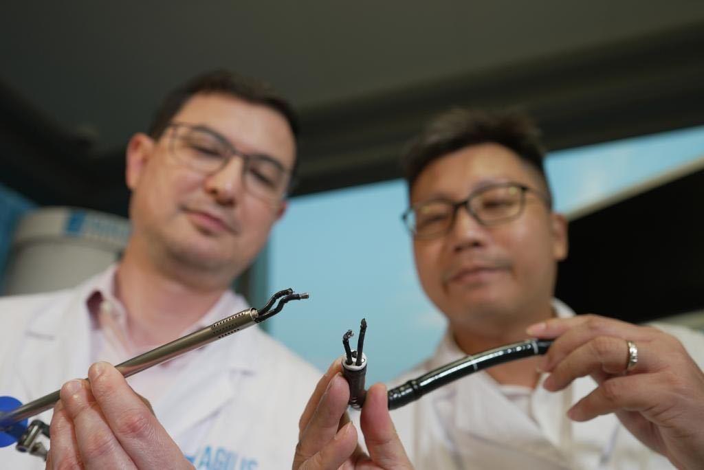 研究人员手持搭载巧捷力柔性机械臂的膀胱镜和胃镜。