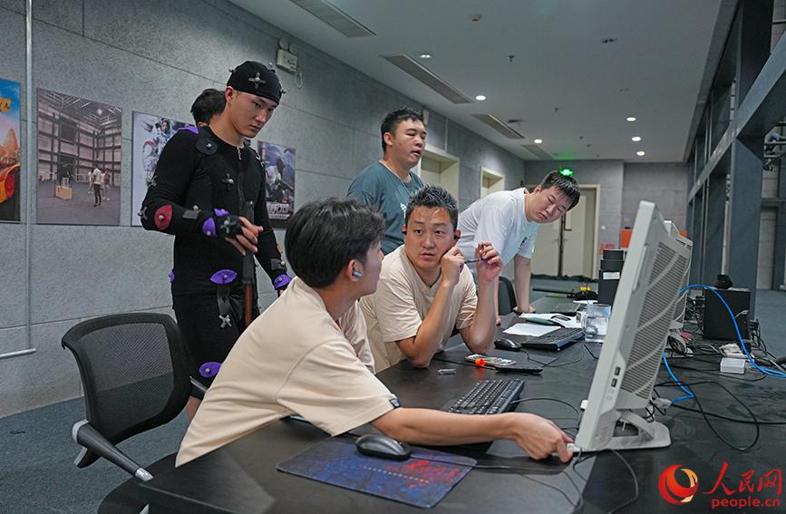 崔晟辑(前排右二)和团队成员在动作捕捉棚内讨论设计方案。 人民网记者 崔新耀摄