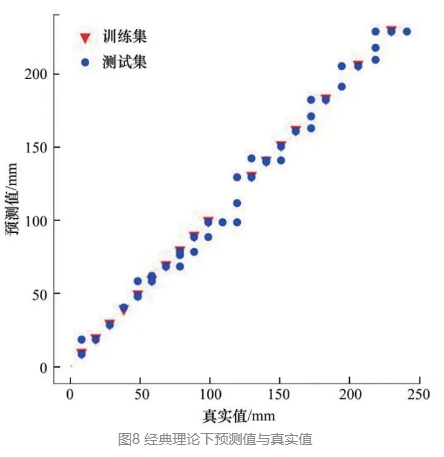 将总的样本N随机分为训练集N1和测试集N2,在经典的机器学习理论下训练集占总样本比例为25%,测试集占总样本比例为75%。在图8中,横轴为样本裂纹长度的真实值,纵轴为模型的预测值。可以看出训练集与预测集分布较为一致。