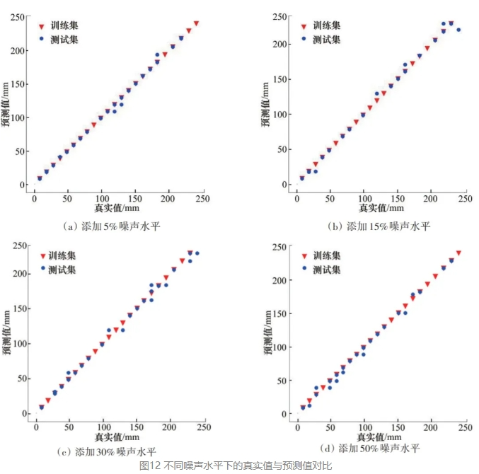 在实际监测中环境噪声和系统噪声等都会对模型预测准确率产生影响,有必要对不同噪声水平下的模型误差进行对比。通过对全部样本添加5%、15%、30%、50%的噪声水平,观察GBRT模型对噪声的抵抗能力来验证模型的鲁棒性。如图12所示,分别为添加5%、15%、30%、50%噪声水平时,所有样本下裂纹长度的真实值与预测值的对比。