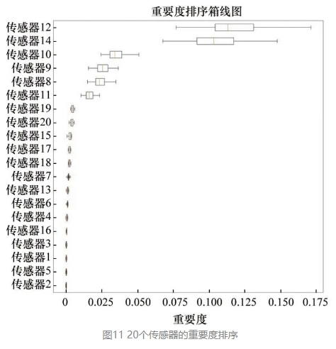 建立模型之后,特征重要性能够增强模型的可解释性,帮助建立对应于应力点与裂纹长度识别的依赖关系模型。同时为了避免不重要特征的输入引起的对模型的干扰,以及便于冗余信息的排除,提高模型的训练速度,对20个传感器的重要度进行分析。基于置换检验的思想对特征重要性进行检测,模型训练完成后,通过模型的Permutation_Importance功能查看输入特征对预测长度的影响。