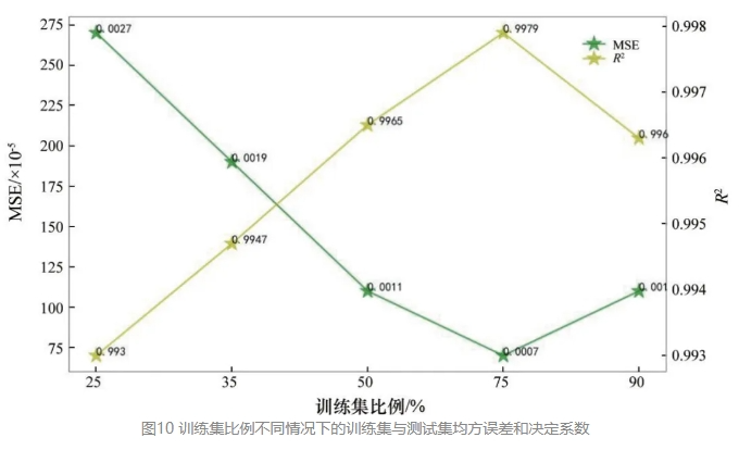 图10给出了测试集与训练集在上述比例下模型的均方误差和R2。在初始阶段,训练集占比逐渐增大时,测试集均方误差逐步下降且R2逐渐上升,代表模型学习到的信息更多。此过程表明,在训练过程中,模型的参数更加贴近真实的数据情况。在训练集比例达到75%之前,该模型的学习程度不断加深,各参数的更新更符合裂纹的扩展情况。当训练集的比例到达90%时,均方误差上升且R2下降,意味着训练集过多而测试集过少,训练集和测试集的分布比例相差过大会导致均方根误差增加,即在这种情况下的误差相比训练集比例达到75%时的误差更大。同样地,其R2也出现了下降的问题,2个指标可以表明模型出现过拟合现象。后续部分以训练集比例75%为前提进行分析与训练。