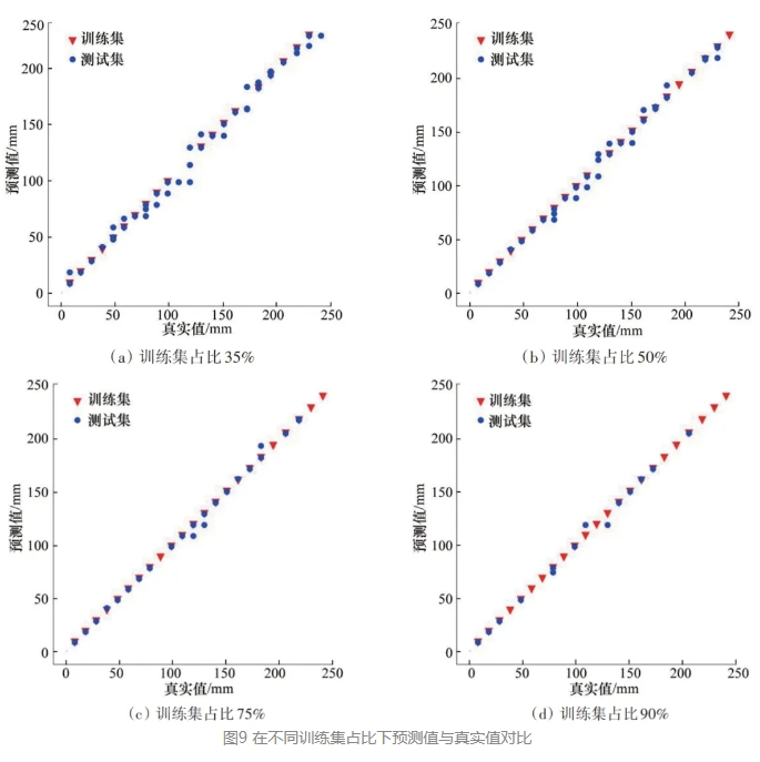 逐步提高训练集样本数在总样本数中的占比,以期提高机器学习水平。因此,将训练集样本比例提高至35%、50%、75%和90%。同时可以验证不同数据集对整体训练结果带来的影响,结果如图9所示。