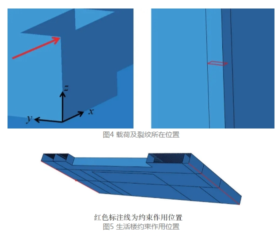 为实现生活楼局部模型的裂纹扩展试验过程,利用XFEM方法在海洋平台生活楼右后角隅部加入初始长度的一定的初始裂纹。在水平荷载下最终加固方案可以抑制裂纹的扩展。裂纹附近应变呈梯度分布。