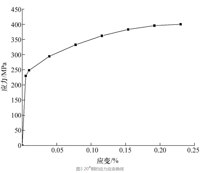 金属管道采用如图3所示的20#钢的应力应变曲线作为输入条件,弹性模量为206GPa,泊松比为0.3。