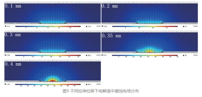 由图9不同拉伸位移下电解液中腐蚀电场分布可知,随着拉伸位移的增大,腐蚀电场显著增大。在弹性变形阶段,当拉伸位移为0.1、0.2、0.3mm时,在缺陷中心附近腐蚀电场分布较为均匀,在缺陷两端点处电场模值最大,分别达到了11.9、24.0、36.3mV/m,主要原因在于端点处存在应力突变,净电流密度较大,形成了较大的腐蚀电场。在塑性变形阶段,当拉伸位移为0.35、0.40mm时,在缺陷中心的腐蚀电场显著增大,分别达到了45.0、99.2mV/m,在缺陷中心附近腐蚀电场分布极不均匀,主要原因在于塑性变形造成腐蚀缺陷中心应力集中,使得溶液电位负移,溶液电位差存在从而形成应力腐蚀电偶造成较大的电位差值,且腐蚀缺陷的面积远远小于非缺陷区域,形成了小阳极大阴极的电偶对,综合造成随着拉伸位移增大,腐蚀净电流密度较大,腐蚀电场模值增大。