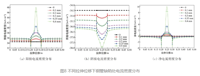 由图8不同拉伸位移下金属管道缺陷处电流密度分布可知,当拉伸位移为0时,20#钢金属管道表面的阴阳极电流密度均相等,均为34.4mA/m2,净电流密度为0。当拉伸位移为0.1、0.2、0.3mm时,缺陷部位处于弹性变形阶段,在同一拉伸位移下从缺陷中心部位向两侧阴阳极电流密度变化逐渐减小,在缺陷中心阴阳极电流密度大小达到最大值,在缺陷两端阴阳极电流密度大小为最小值,随着拉伸位移的增大,阴阳极腐蚀电流密度随之增大,在不同拉伸位移下缺陷中心阳极电流密度分别为34.2、37.1、38.2mA/m2,但阴极电流密度增大幅度较小,缺陷中心阴极电流密度分别为−34.3、−34.8、−36.7 mA/m2,在缺陷中心附近净电流密度分别为0.45、1.1、1.5mA/m2。当拉伸位移为0.35、0.4mm时,缺陷部位处于塑性变形阶段,在缺陷中心处的阳极电流密度显著增大,分别达到40.7、48.1mA/m2,在缺陷中心处的阴极电流密度也增大,分别达到−37.2、−37.9 mA/m2,但增大幅度小于阳极电流密度变化幅度,造成在缺陷中心处的净电流密度增大,分别达到3.5、10.2 mA/m2,主要原因在于拉伸位移为0时,金属管道的氧阴极还原的电流密度与阳极氧化电流密度的大小相等,随着拉伸位移增大,阴极电流密度大小随之增大,当腐蚀缺陷处发生弹性变形时,缺陷长度上的净电流密度较小,而发生塑性变形时,缺陷中心的净电流密度急剧增大,而缺陷两边的净电流密度为负,说明塑性变形对阴极还原反应力学化学效应的影响大于弹性变形,缺陷附近应力分布的不均匀引起了局部的应力腐蚀电偶。