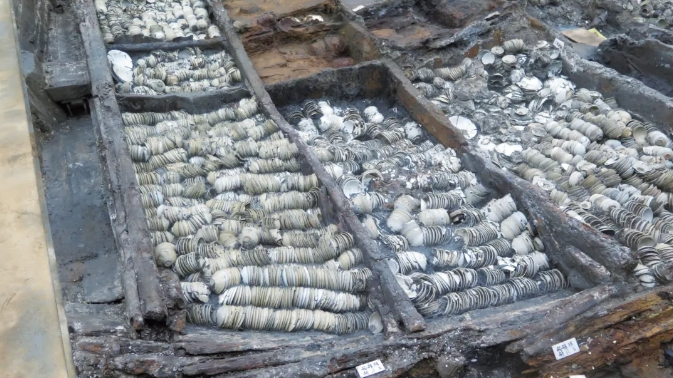 南海一号沉船位于广东省台山与阳江交界海域,于20世纪80年代末期发现,后经2007年整体打捞移入广东海上丝绸之路博物馆内(图3)。2014年开始全面考古发掘,是迄今为止中国水下考古最重要的发现,亦是海上丝绸之路的重要遗迹。船体结构基本保存于海泥之下,是一条满载货物的南宋时期的外贸商船,属于适合远洋航行的福船船型(图4)。发掘出18余万件船货与生活物品,其中以瓷器、铁器、铜器、钱币最为大宗(图5)。大量的贸易瓷器是为适应不同市场需求的外销品种,而不同文化的审美、器型、工艺等也对中国瓷器产生了巨大的影响;铁器、铜器、丝绸等手工艺制品以及日常生活用品也已成为输出的主要货物;沉船中发掘出土大量金、银、铜币,显示出宋代高度发达的商品经济并涉及到海外贸易体系中。10世纪以后海上丝路开始进入极盛时期,中外交流已极为频繁,不同文化间的交流融合持续发展,海洋成为相互联系的桥梁和窗口。