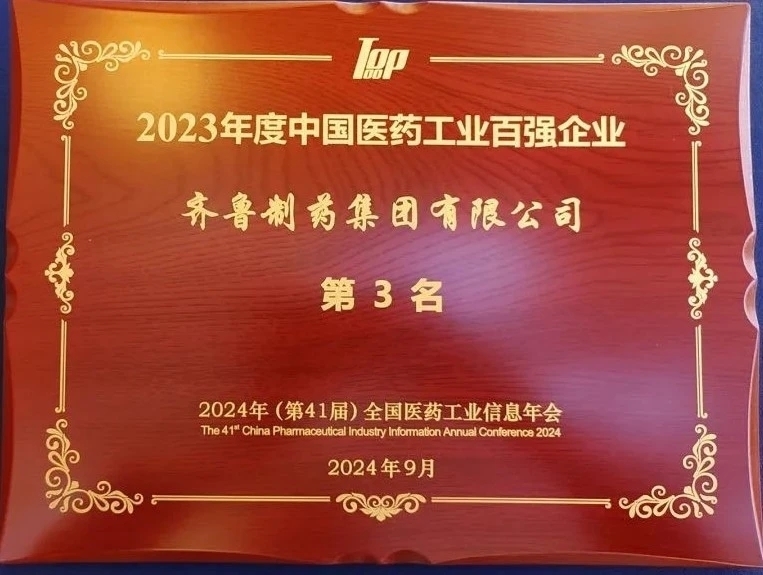 齐鲁制药集团第九次进入中国医药工业百强企业全国前十,名列第三位,上升两个位次。同时位列“2024年中国医药研发产品线最佳工业企业”第二位,并荣获“2023年度中国医药企业社会责任优秀案例”。