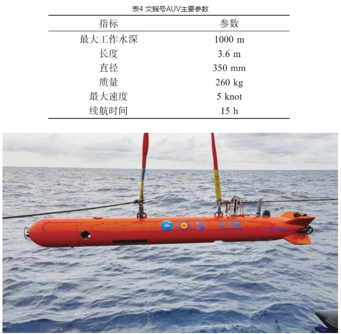 2020年,在国家重点研发计划项目支持下,国家文物局考古研究中心联合中国科学院深海科学与工程研究所等单位,共同开展了水下考古探测关键技术研究项目,并在项目支持下研制了文鳐号水下考古AUV(图7)。文鳐号AUV的主要参数如表4所示,其搭载了多波束前视声呐、侧扫声呐和摄像机等探测设备,主要用于执行水下文化遗产等目标的大范围快速搜索和近距离精细探测任务。