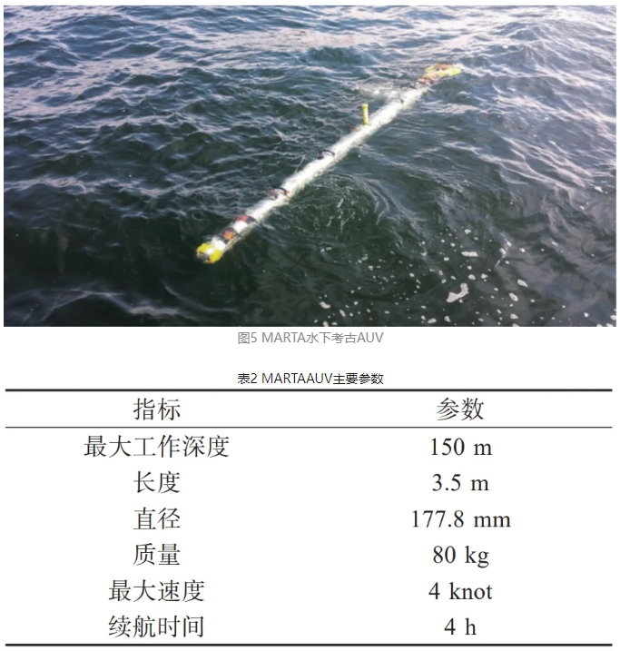 意大利佛罗伦萨大学在欧盟第七框架计划(7th Framework Program,FP7)世界海洋考古机器人系统(Archaeological Robot Systems for the World's Seas,ARROWS)项目支持下,研发了一款名为MARTA(Marine Robotic Tool for Archaeology)的水下考古AUV(图5)。MARTA的主要参数如表2所示,其采用模块化设计,模块之间通过标准电气接口连接,可以根据任务需求临时进行模块更换。MARTA搭载了声学和光学探测设备,声学设备为多波束前视声呐,用于获得海底声学图像。光学设备为立体视觉相机,与照明灯配合采集水下的光学图像信息。