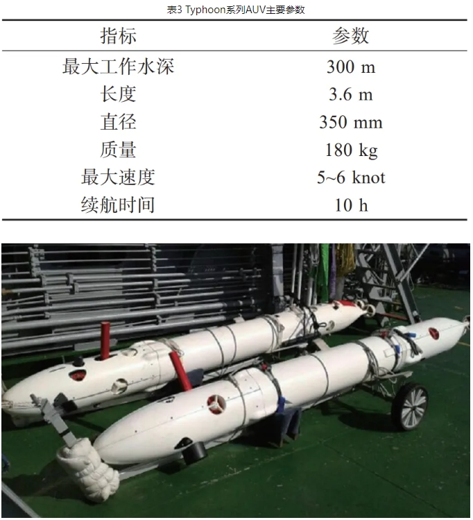 除MARTA外,意大利还研制了Typhoon系列水下考古AUV,用于执行水下文化遗产探测任务。Typhoon系列AUV的主要参数如表3所示,目前共有2台Typhoon系列AUV投入使用,分别为Tifone与Tiftu,两者可协同进行水下遗迹的声学和光学探测(图6)。