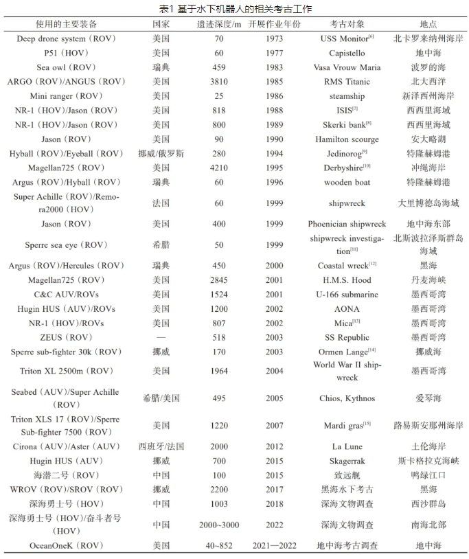 目前,深度30m以内水域的考古工作通常由经过专业培训的潜水员来承担,但潜水作业风险较高,难以实现大深度水域的长时间考古作业。位于海底的沉船遗迹是水下考古研究的重点之一,沉船遗迹通常深度较大,且具体位置难以确定,需要在广阔的海域进行大范围搜索,不借助深海装备的支持难以实现。自20世纪90年代以来,随着水下机器人技术的进步,考古工作者不断尝试基于水下机器人开展考古活动,使用的装备主要包括遥操作水下机器人(remotely operated vehicle,ROV)、载人潜水器(human occupied vehicle,HOV)和自主水下机器人(autonomous underwater vehicle,AUV)等。目前,有水下机器人参与的相关考古工作主要如表1所示。