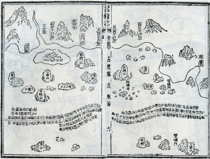 渔山列岛扼据中国沿海航线中段,地处南北海上交通要冲,是远洋航线上的一个重要站点。明代《郑和航海图》中就绘有“鱼山”(图1),表明至少在15世纪前期,渔山之名已经出现,当时称为“鱼山”,郑和下西洋也曾经过此地。成书于清朝康熙末年(18世纪初)的《指南正法》载:“东开二更是大鱼、小鱼,山上有淡水。小鱼北边有沉礁,当使开,不可近小鱼。”此外,《章巽航海图》《清代东南洋航海图》《各处海岛礁屿便览》(宁波天一阁博物馆藏)等航海文献都记载有经过渔山列岛的航线和航法。