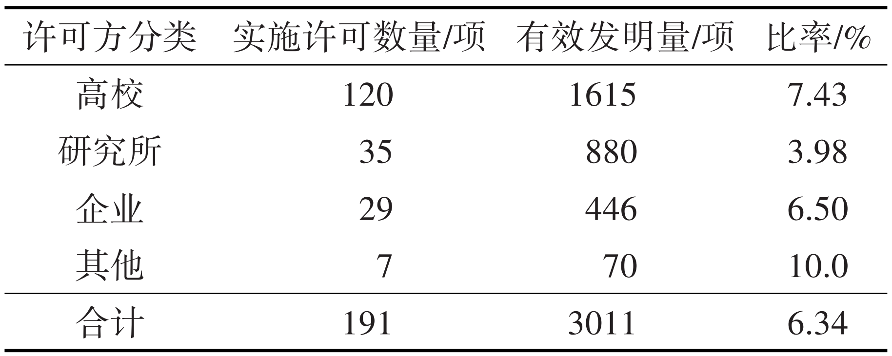 在“水专项”中,191项发明专利有实施许可,主要是源于高校和研究所的专利(许可方),将专利权转移到公司(实施方)后被实施。如表4所示,高校有120项专利有实施许可,约占整个许可方的62.83%;在实施方,主要是公司,有181项专利,约占整个实施方的94.76%。