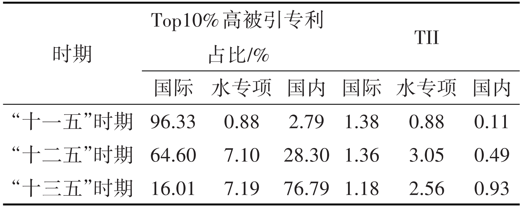 如表6所示,经过多年的技术积累和技术升级,水专项的TII显著提升,到了“十二五”和“十三五”时期,已经远远超过国际和国内的TII。
