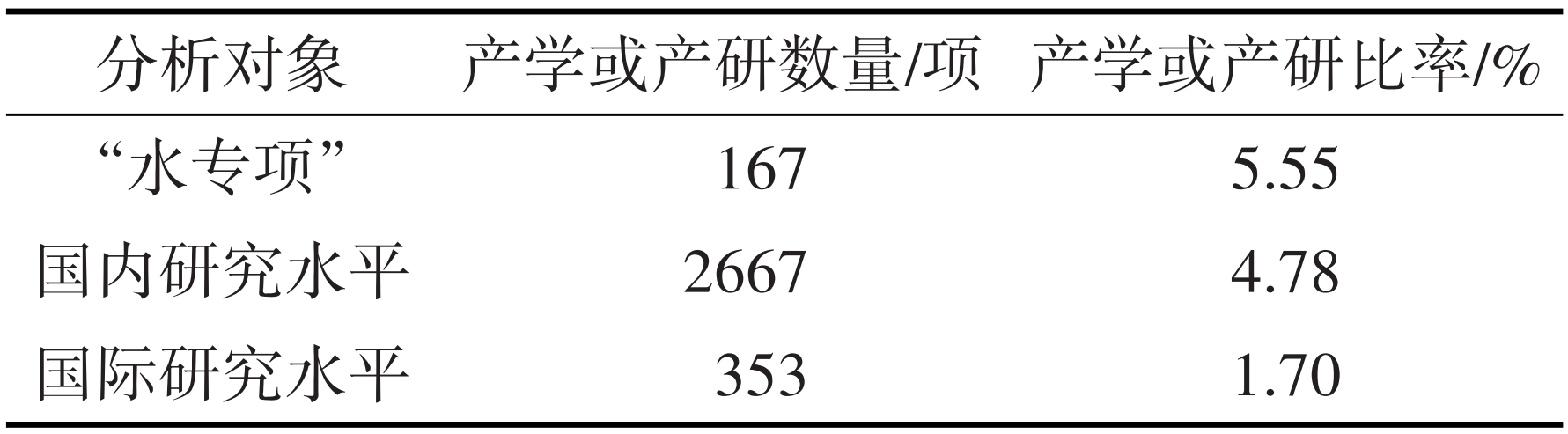 如表3所示,就产学(或产研)合作而言,“水专项”的比率最高,也超过国内的比率4.78%。产学或产研专利主要包括企业和高校,以及企业和研究院两种类型,聚焦于技术发明的应用、市场化和产业化。