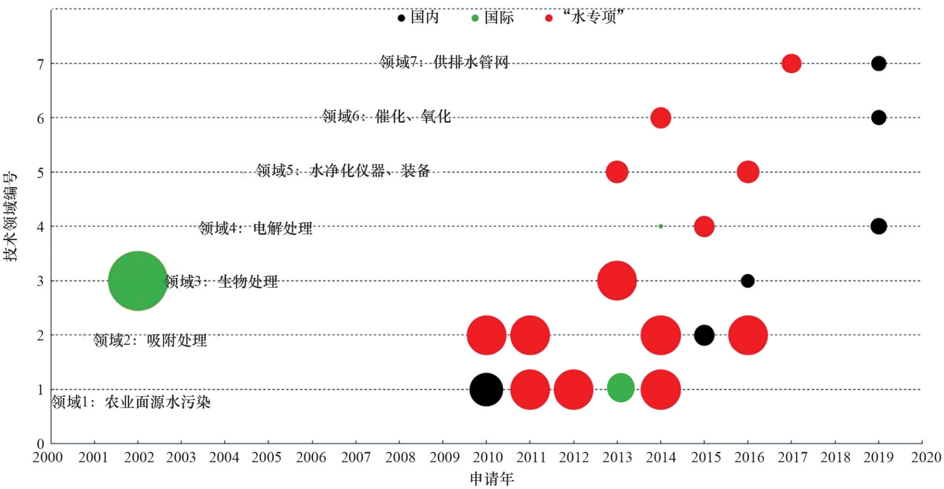 如图7所示,国际方面的发明专利,主要分布在农业面源水污染防治、生物处理和电解处理技术领域;国内方面的发明专利,主要分布在农业面源水污染防治,吸附处理,生物处理,电解处理,催化、氧化和供排水管网技术领域;水专项则完全覆盖7个技术领域。