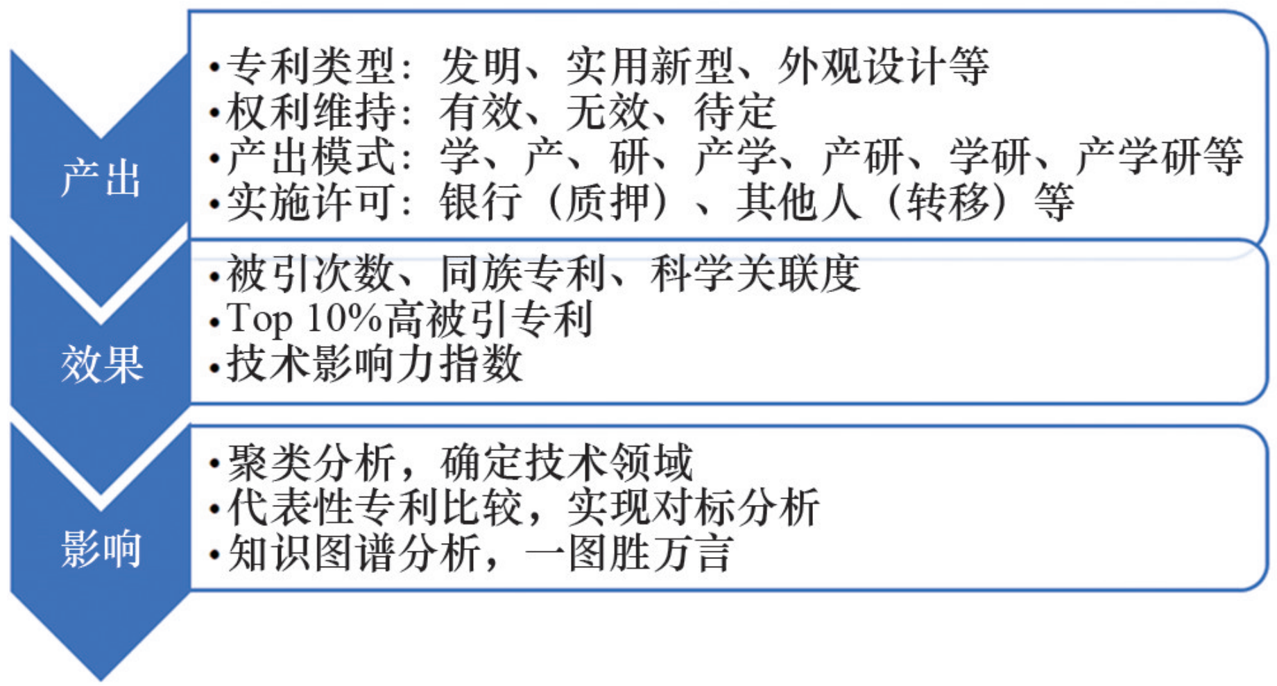 本文从情报学视角设计了一组绩效指标体系,反映项目专利产出的全貌,如图3所示。具体3个方面及其涵盖的指标如下。