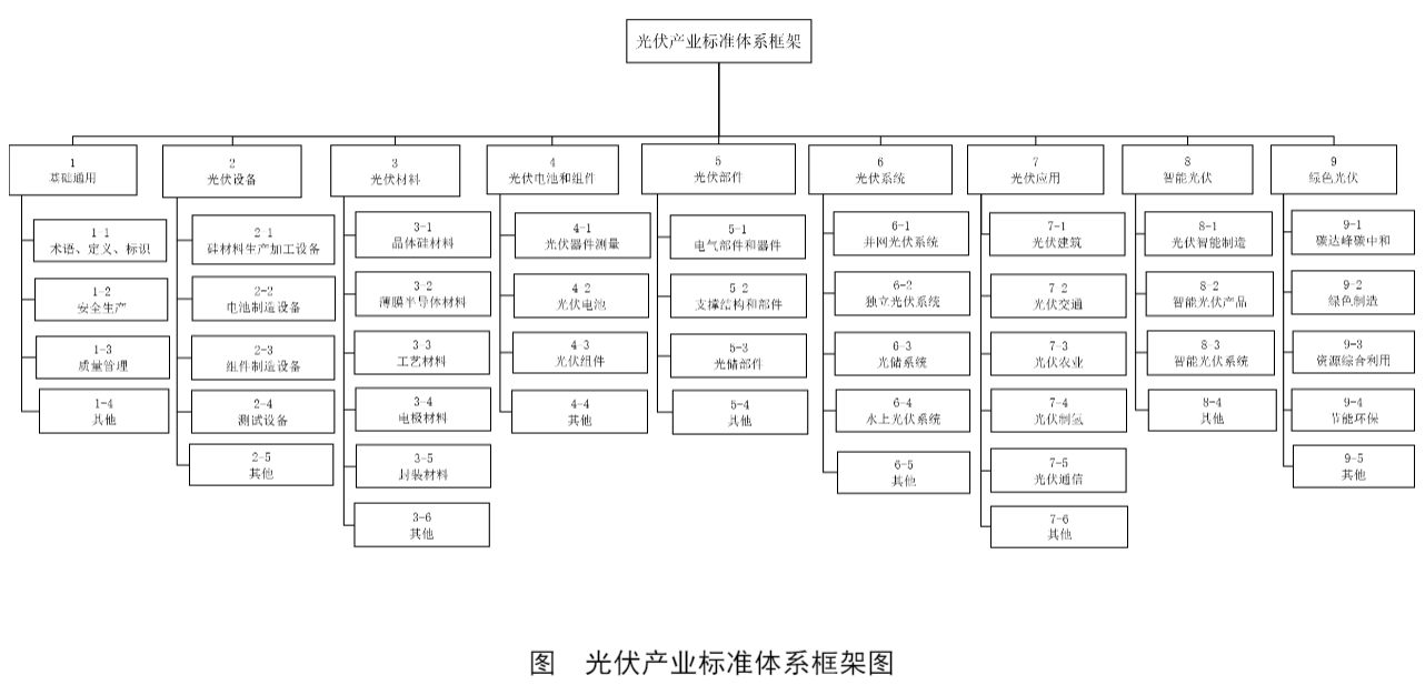 其中,基础通用标准是光伏产业的基础性标准;光伏设备标准主要规范光伏硅材料、电池、组件等环节生产制造及测试设备的技术要求;光伏材料标准主要规范电池和组件生产制造过程中晶体硅材料、薄膜半导体材料等上游原材料及辅助材料的技术要求;光伏电池和组件标准主要规范光伏器件测量方法以及电池和组件的技术要求;光伏部件标准主要规范电气部件和器件、支撑结构和部件、光储部件等技术要求;光伏系统标准主要规范光伏系统的设计、运维、测试、评价等技术要求;光伏应用标准主要规范光伏与其他领域融合应用的技术要求;智能光伏标准主要规范光伏智能制造、智能光伏产品以及智能光伏系统等技术要求;绿色光伏标准主要规范光伏产业全生命周期绿色低碳发展及资源综合利用等技术要求。