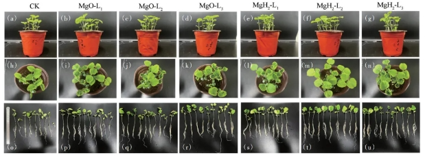 图6 CK组、MgO组和MgH2组大豆幼苗的全苗、俯视和平视图