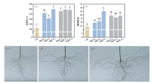 图8 MgH2、MgO包衣对大豆幼苗总根长(a)、侧根数(b)的影响,以及CK(c)、MgO-L2(d)、MgH2-L2(e)大豆根系照片