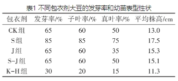 为了优选出合适的包衣剂,比较了S组、J组、S-J组和K-H组的发芽率,并对7d大豆幼苗的平均株高、子叶率和真叶率作对比研究,结果见表1。