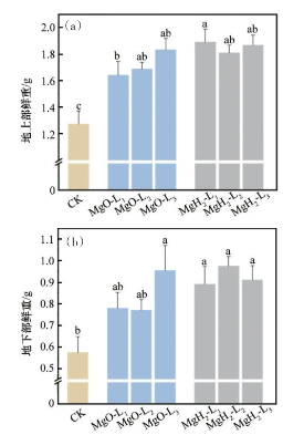 图5 MgH2、MgO包衣对大豆幼苗的地上部(a)和地下部鲜重(b)的影响