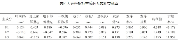 运用SPSS软件对大豆所测得的所有指标进行主成分分析,并计算特征值、特征向量和贡献率,如表2所示。前3个主成分F1—F3的累计方差贡献率达到69.317%,包含了原始变量的大部分信息,也降低了变量个数。3个主成分的特征值分别为4.318、1.419和1.195。F1的特征向量中较大的分量是发芽势、发芽率和发芽指数,说明F1可能代表了影响种子发芽的因素,其贡献率为43.178%,说明发芽因素对包衣大豆种子的萌发性状贡献较大。F2的特征向量中总根长具有高载荷(0.828),说明F2可能代表影响植物根部发展的因素,其贡献率为14.187%。F3特征向量中叶面积具有高载荷(0.843),这表明F3成分与植物的叶面积相关性较高。