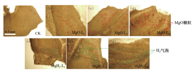 对大豆幼苗的叶面积进行分析,结果如图9所示。由图9可知,MgO组的叶面积较CK组增加,而MgH2组的叶面积较CK组显著增加。CK组的平均叶面积为553.0mm2,MgO-L1、MgO-L2、MgO-L3的平均叶面积为718.8、678.4和748.7mm2,较CK组均提升。而MgH2组的平均叶面积较CK组显著提升,其中,MgH2-L2的平均叶面积为1169.0mm2,相较于CK组提高了111.4%,而MgH2-L1和MgH2-L3的平均叶面积分别提高60.0%和83.7%。因此,MgH2包衣显著提高了幼苗的叶生长。幼苗的叶生长分析结果表明氢和镁协同促进了叶的生长发育。镁和氢的协同作用有利于调控叶绿素、气孔导度、光化学电子传递速率等来增强叶片的光合作用和蒸腾作用。
